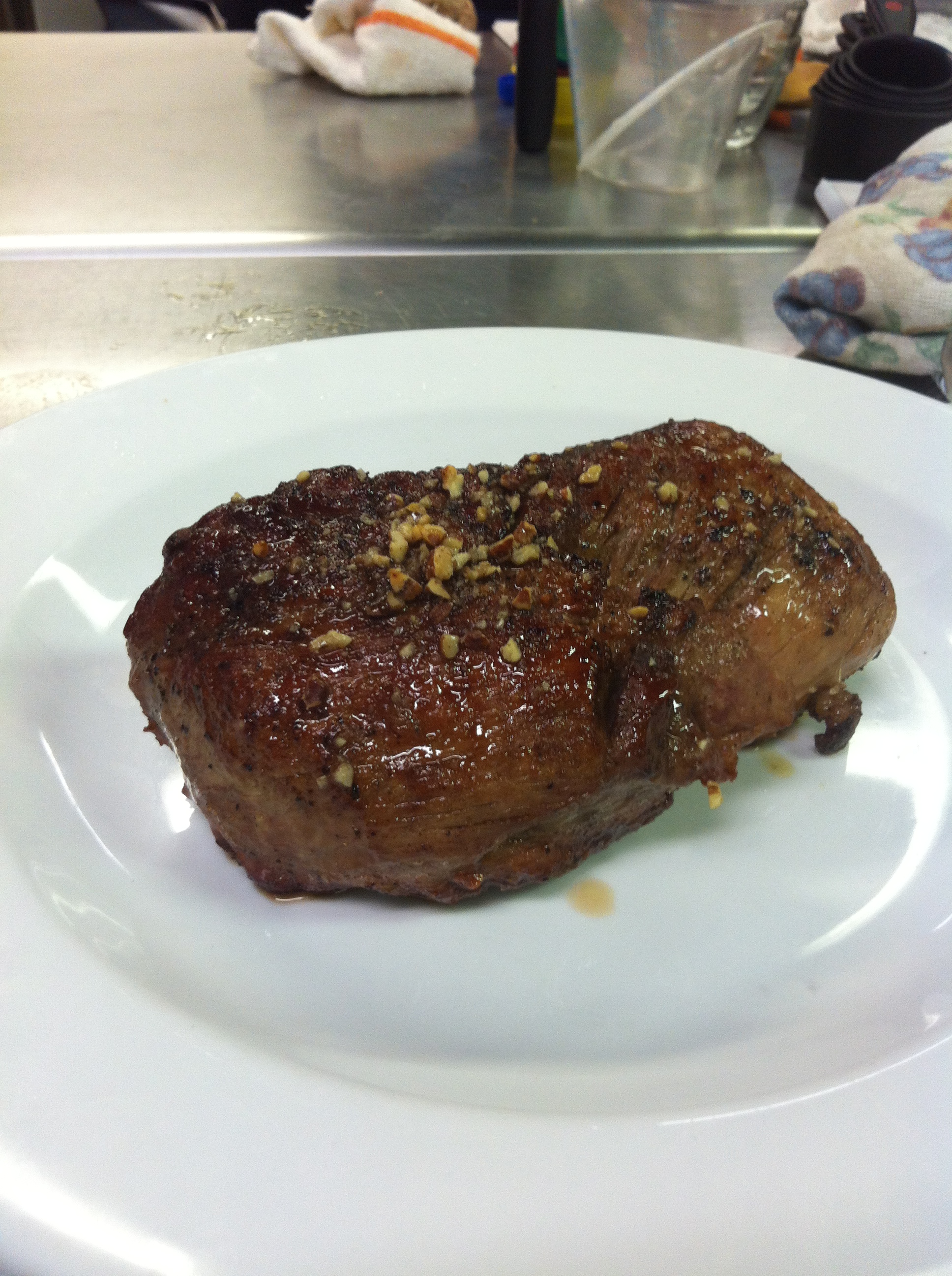 In week two of the cooking classes we learned how to prepare and cook various forms of meat. The class started with a talk about the various types of each meat, ie the difference between choice and prime cuts of beef. We were then walked through where on the animal various cuts of meat came from. After the short lesson the chef taught us how to prep and French a rack of lamb and prep a pork and veal tenderloin. Then we got into the cooking. I chose to cook a roasted veal tenderloin with a maple bourbon glaze, Ben I’m sorry about the veal. One skill I will take away from this recipe was learning how to properly sear a piece of meat. From properly preheating the pan to the proper time to flip the meat. The chef was very good about answering any questions we had during the class. A few of the other dishes from the class that stood out were the beef stroganoff, the Thai curried pork, and the tri tip that the head chef prepared for us. I look forward to trying out those dishes in the near future.