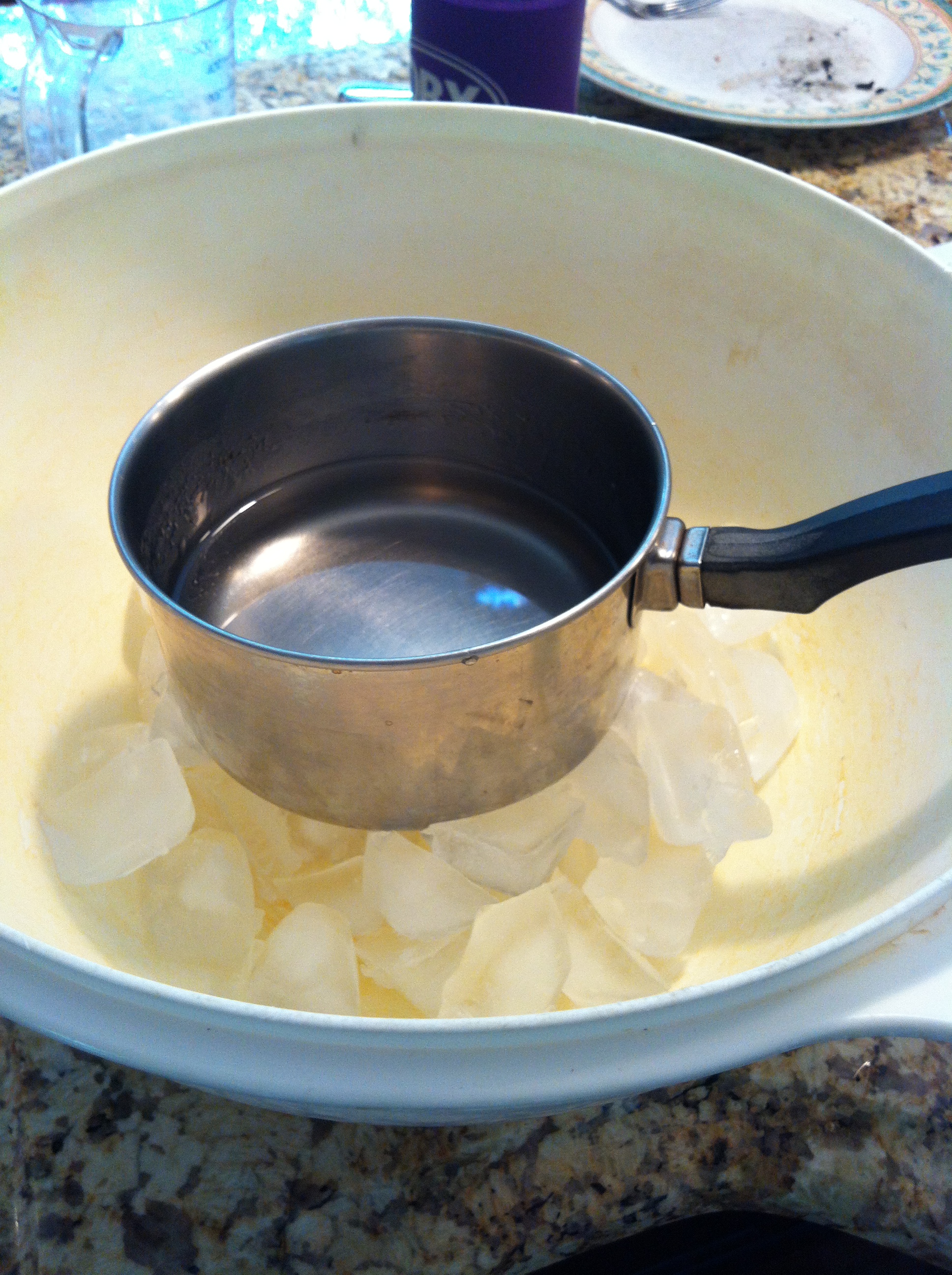2) Place pan in a large ice-filled bowl until sugar mixture cools, about 15 minutes. Stirring occasionally.