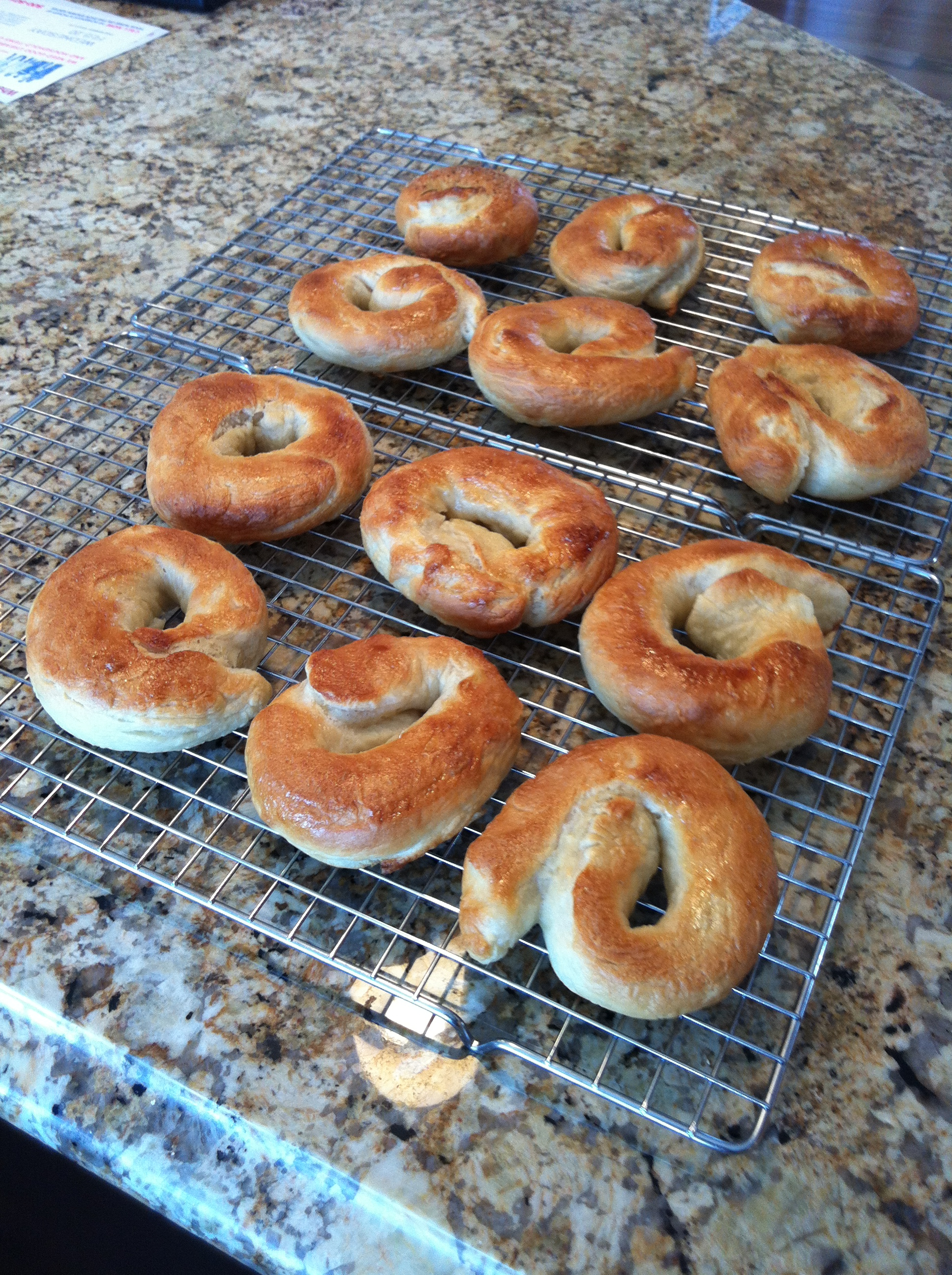 - Divide the dough into 12 pieces; roll each piece into a 10-inch-long rope. Form into bagels by overlapping the ends up 1 inch. Pinch ends together firmly. Set bagels aside, uncovered, to rise until slightly puffy, about 20 minutes.