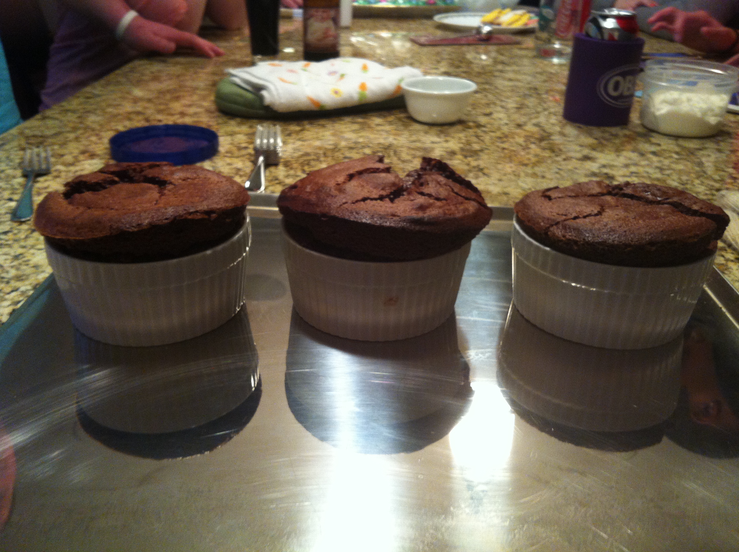 7) Remove souffles from fridge and allow to come to room temperature. Preheat oven to 400 F, (375 F for convection oven). Place ramekins on baking tray and place tray on middle rack. bake souffles for ~18-20 mins or until done.