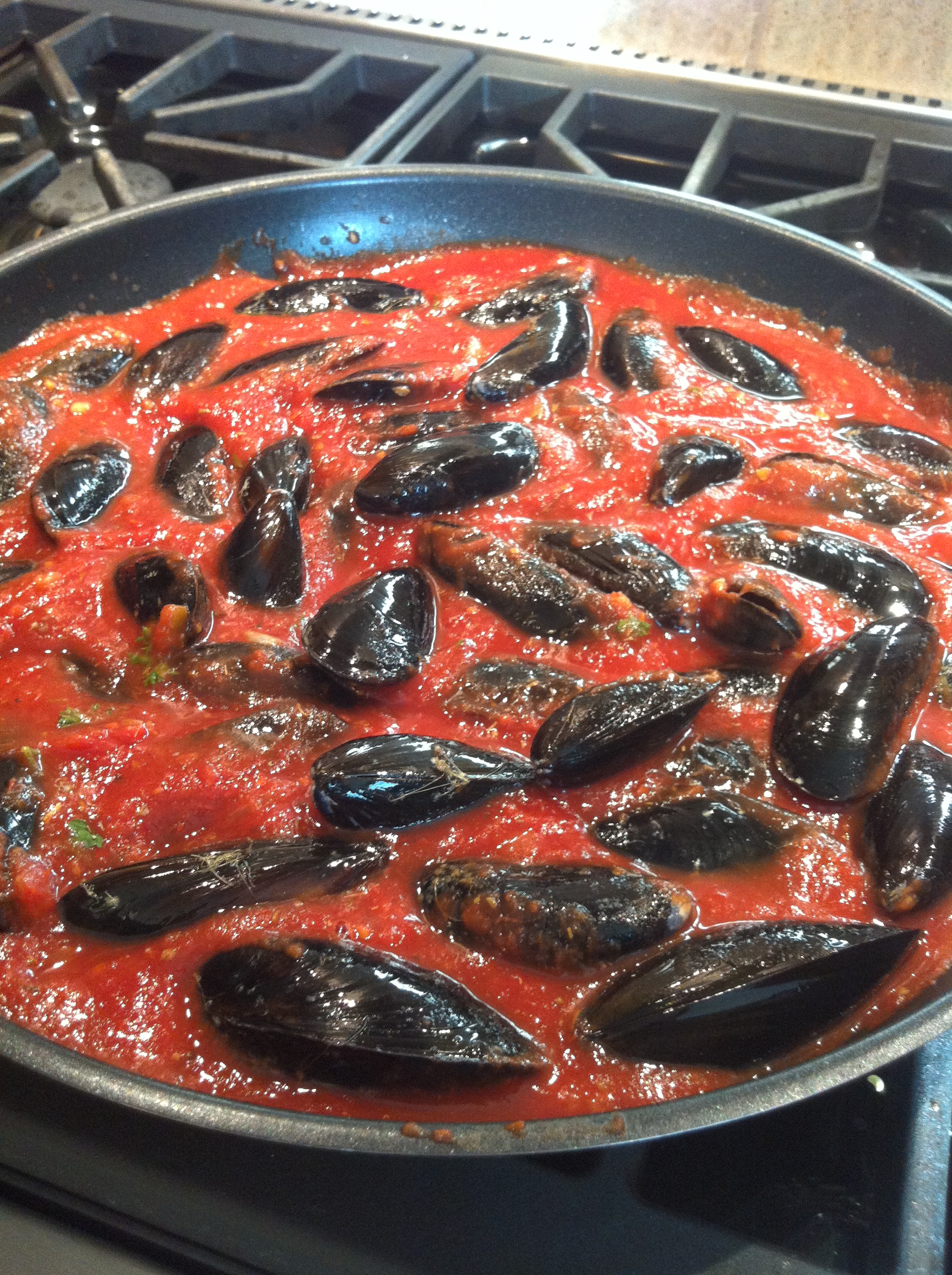 4) Add mussels and cover with aluminum foil, cook for 10-12 minutes.