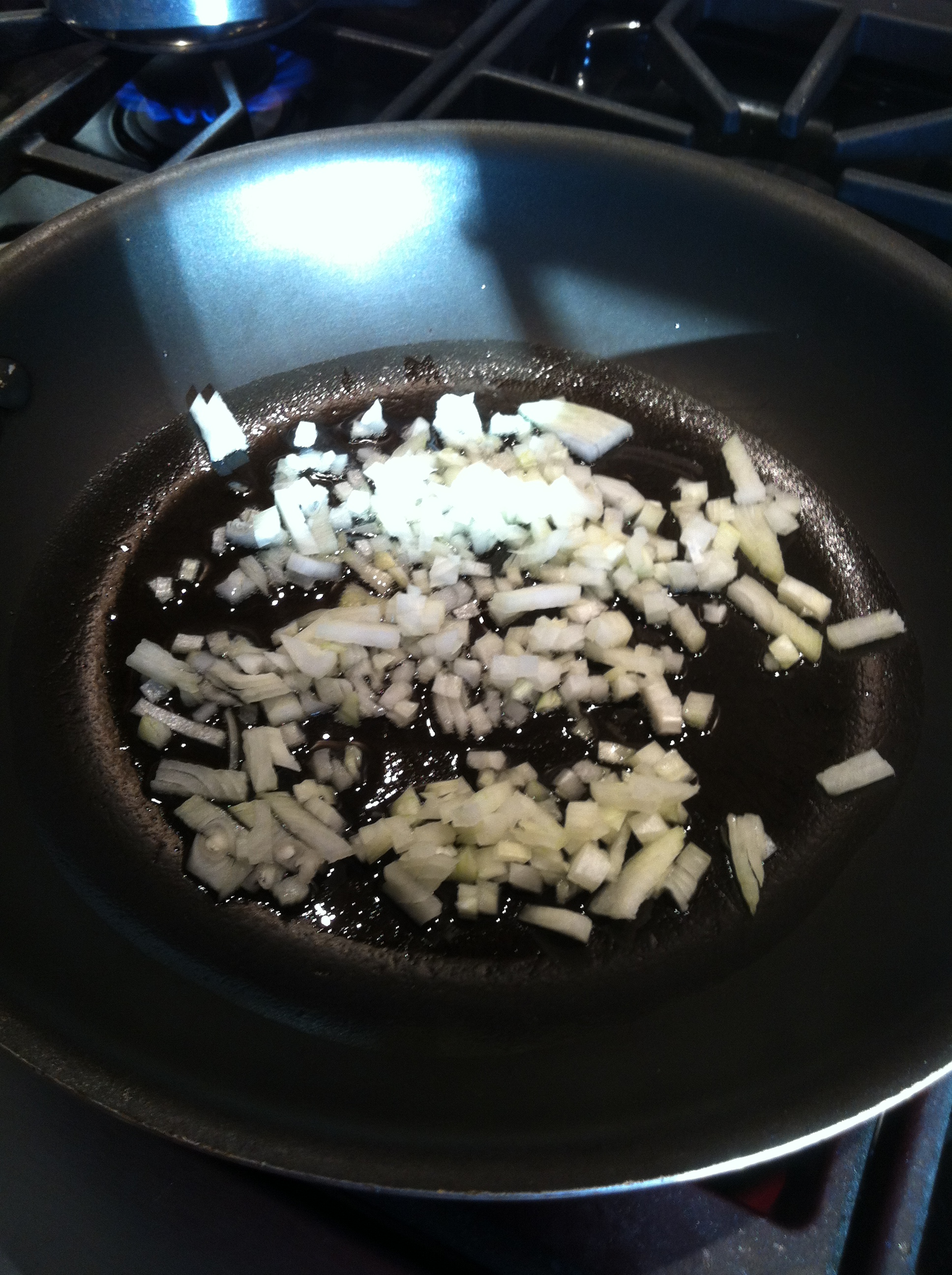 2) Heat oil in a large nonstick skillet over medium-high heat. Then add onion to pan; saute 4 minutes or until tender. Add Garlic and saute an additional 30 seconds.