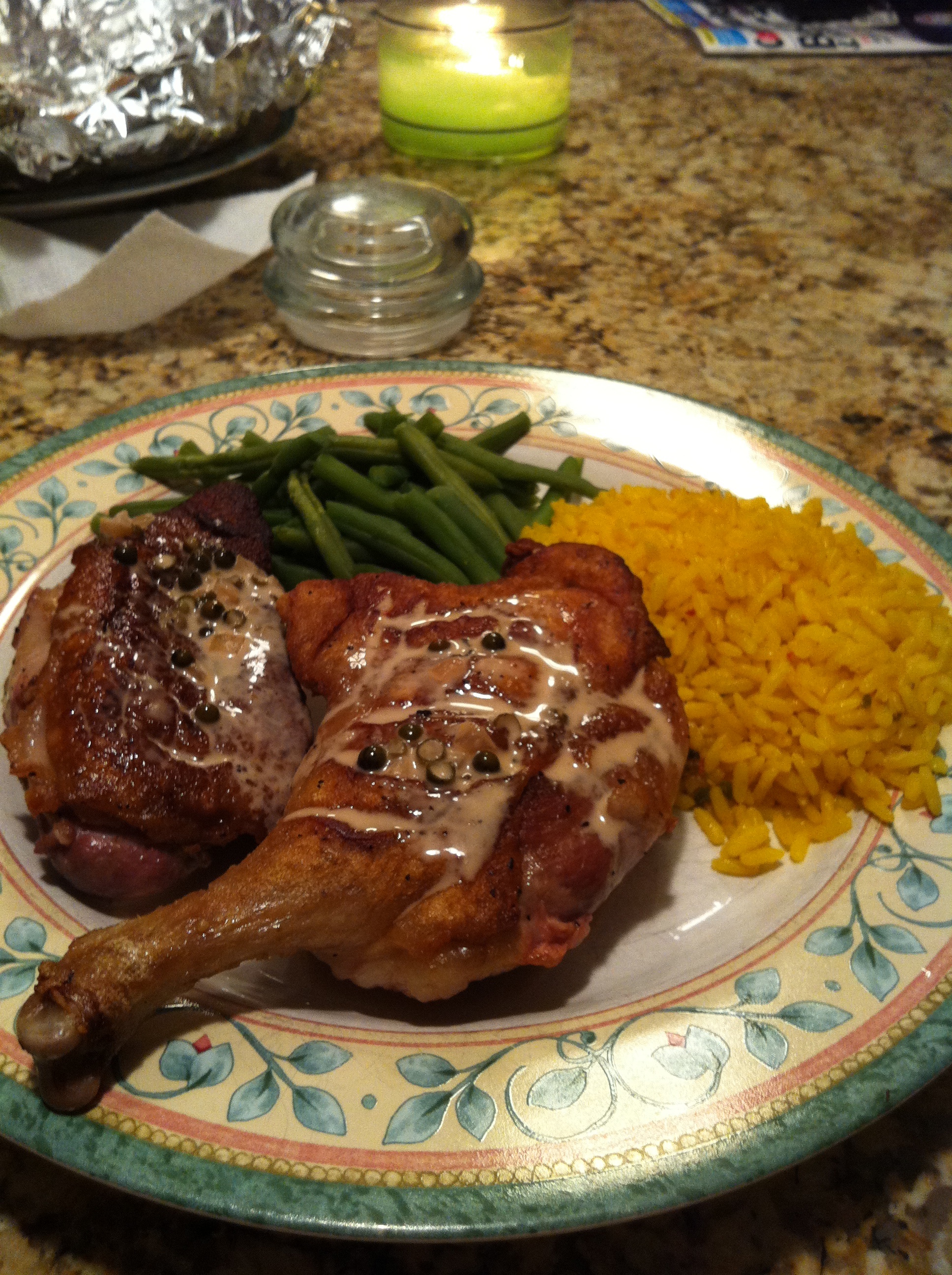 After experimenting with the duck dish earlier in the week I wanted to make something that used the duck fat I had saved. In the end I decided to make a Normandy style pan sauce to put over pork chops. This sauce is very rich and packs a lot of flavor. It would go well over chicken and lamb as well so feel free to mix it up.