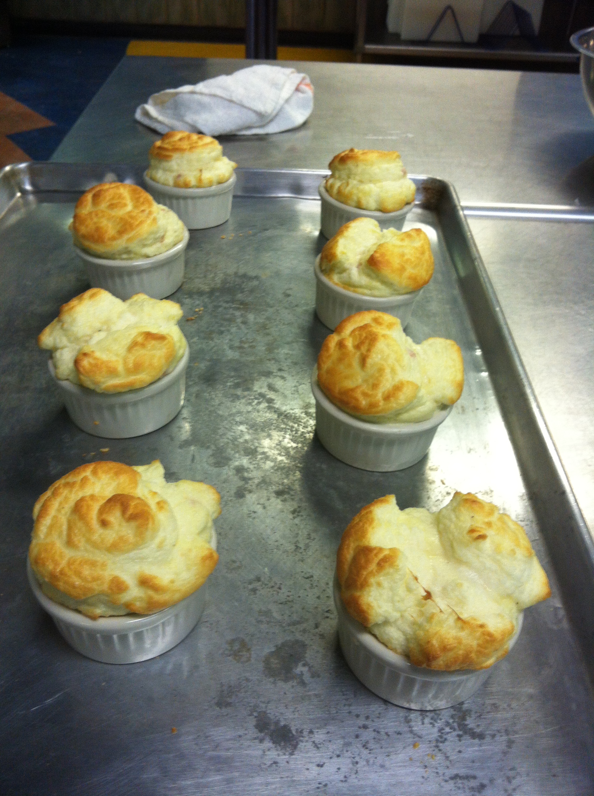I chose to make a basic ham and cheese souffle in the class. Unfortunately I was unable to take pictures throughout the cooking process but I will give a few of the tips I learned. On Sunday I will post step by step pictures for the next souffle I make. The hardest part of making the souffle was whipping the egg whites. It is quite exhausting and as delicate as souffles are they are rough on the cook. An important tip before you whip the egg whites, add a pich of salt and 1 tsp cream of tartar for every 8 egg whites. These ingredients will help the eggs fluff up and not become too bubbly. It is also important to line your ramekins with something to allow the souffle to grip something as it climbs up the wall. For this souffles I used butter and Parmesan cheese. If I were making a sweet souffle I would have used sugar. The final tip came when we were mixing the base with the egg whites. During this step you want to keep folding the base over the whites until the mixture looks faintly streaky, do not stir the two together.