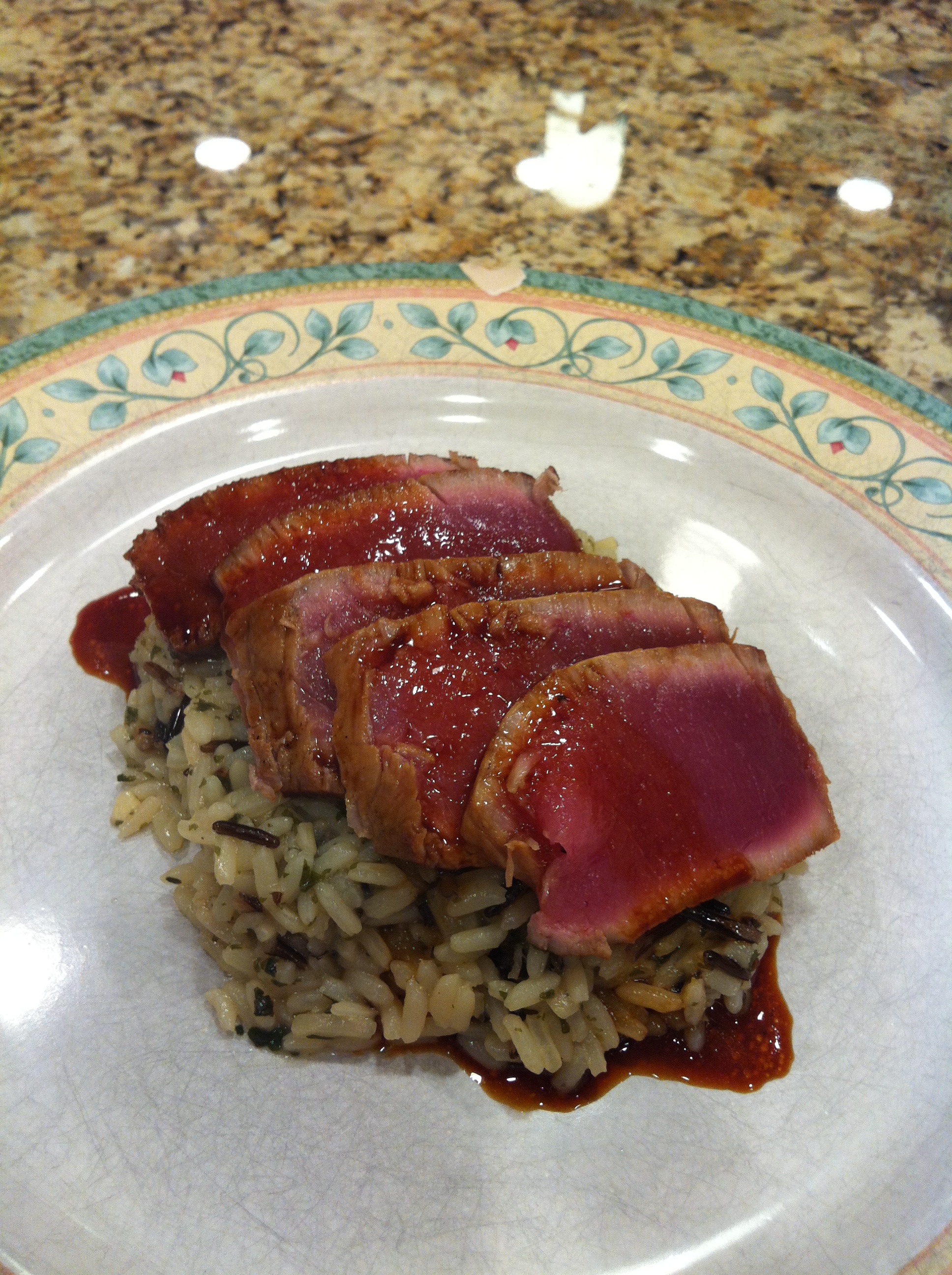 Earlier this year I went down to Richmond, VA to visit my sister. While I was there we went to Edo’s Squid, a hole in the wall restaurant in Richmond. While we were there my sister got an amazing tuna dish and I asked the waitress how they made the sauce that was served with it. This was my attempt at their dish, and from what I can remember it came very close to the one I had in Richmond. To cook the tuna I used the Himalayan salt blocks and seared the tune for a little over a minute a side. To make the Tamari butter sauce I combined butter Tamari soy sauce, lemon juice, and black pepper; then I reduced the sauce and added a bit of flour to thicken it. This sauce is not as salty as soy sauce because the Tamari soy sauce adds a deeper richer flavor that regular soy sauce. I served the tuna over wild rice. Enjoy!